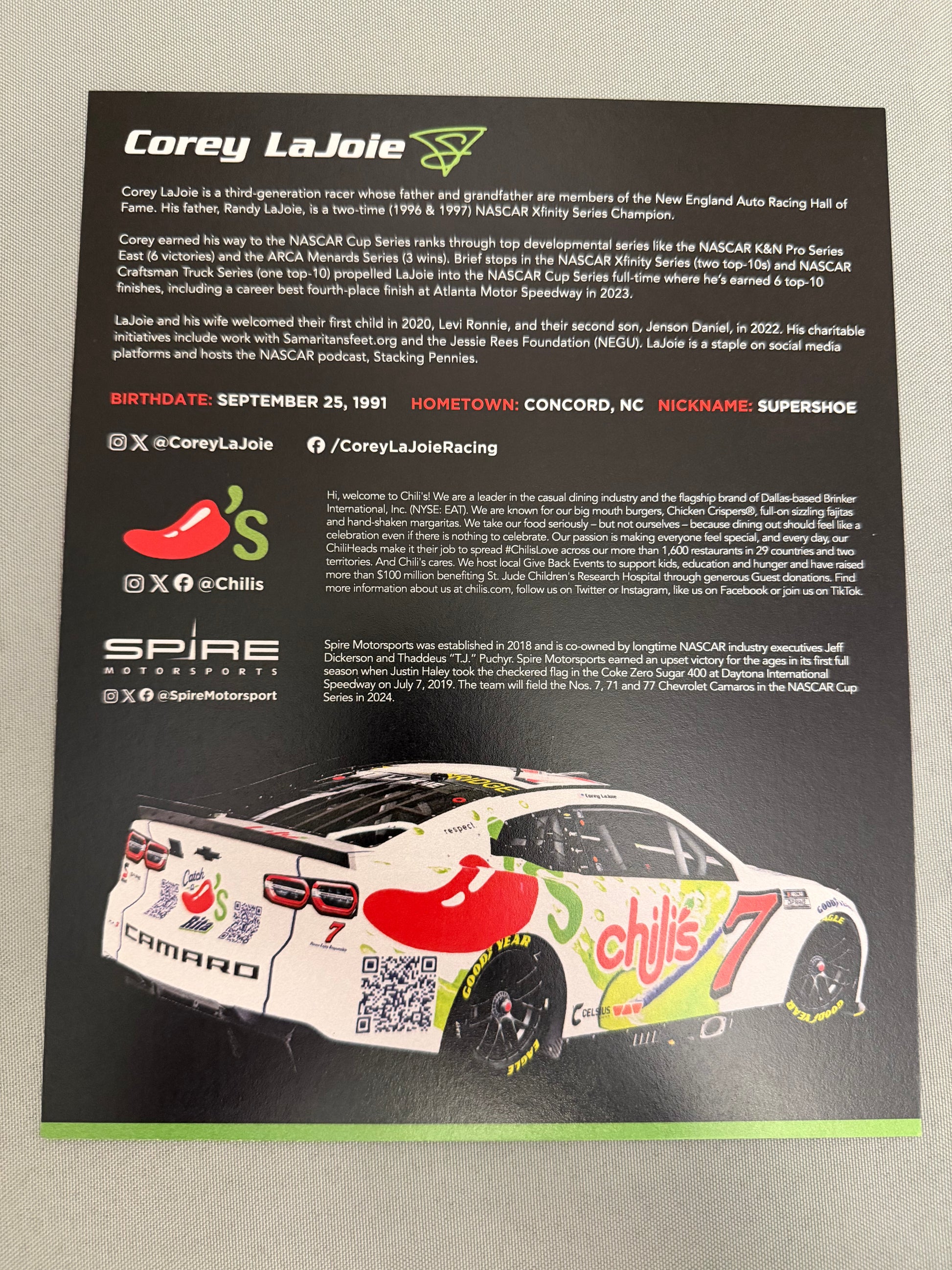 Corey Lajoie #7 2024 Chilis Catch A Rita Nascar Hero Card