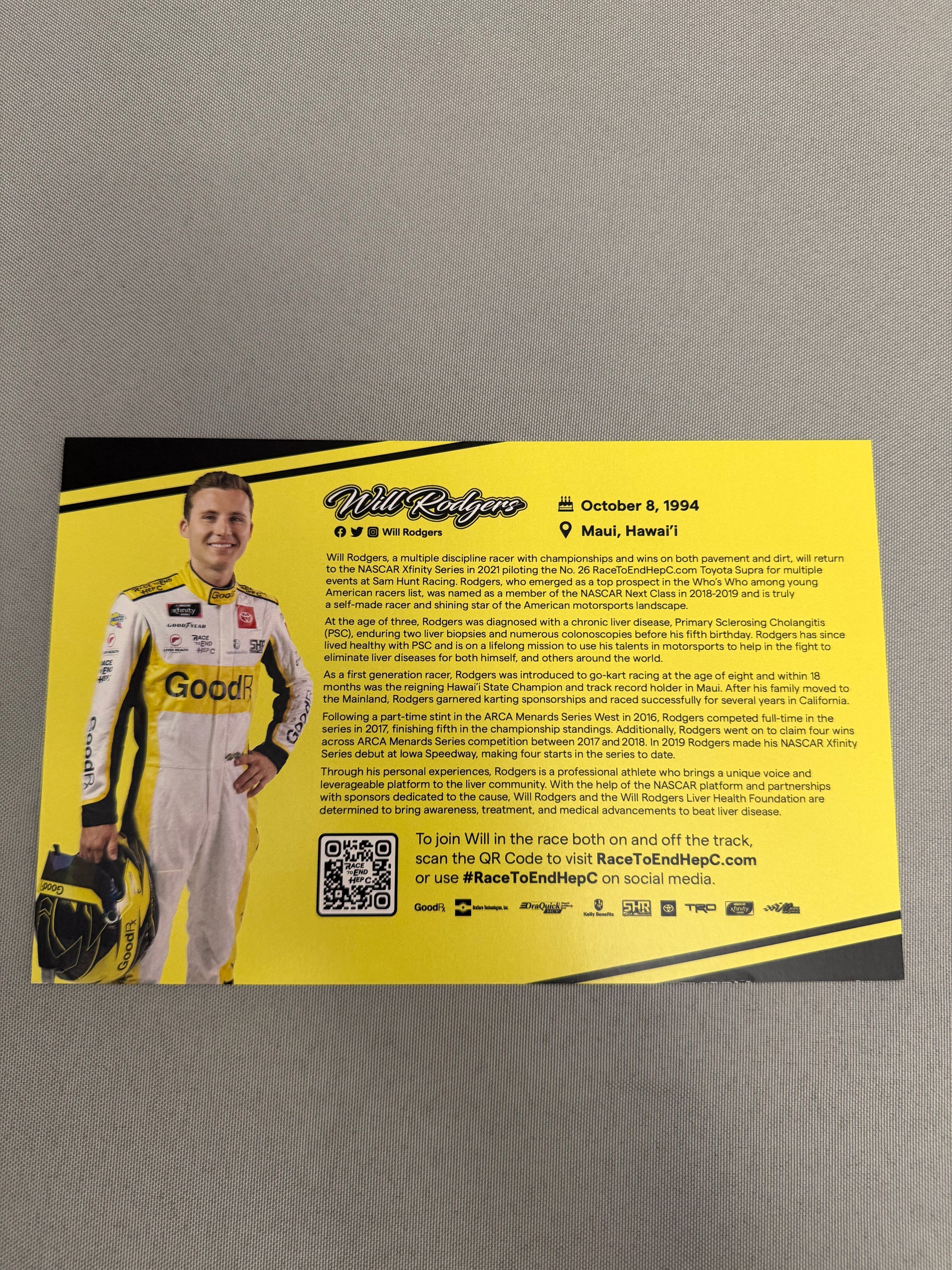 Will Rodgers #26 2021 Race to End Hep C Nascar Hero Card