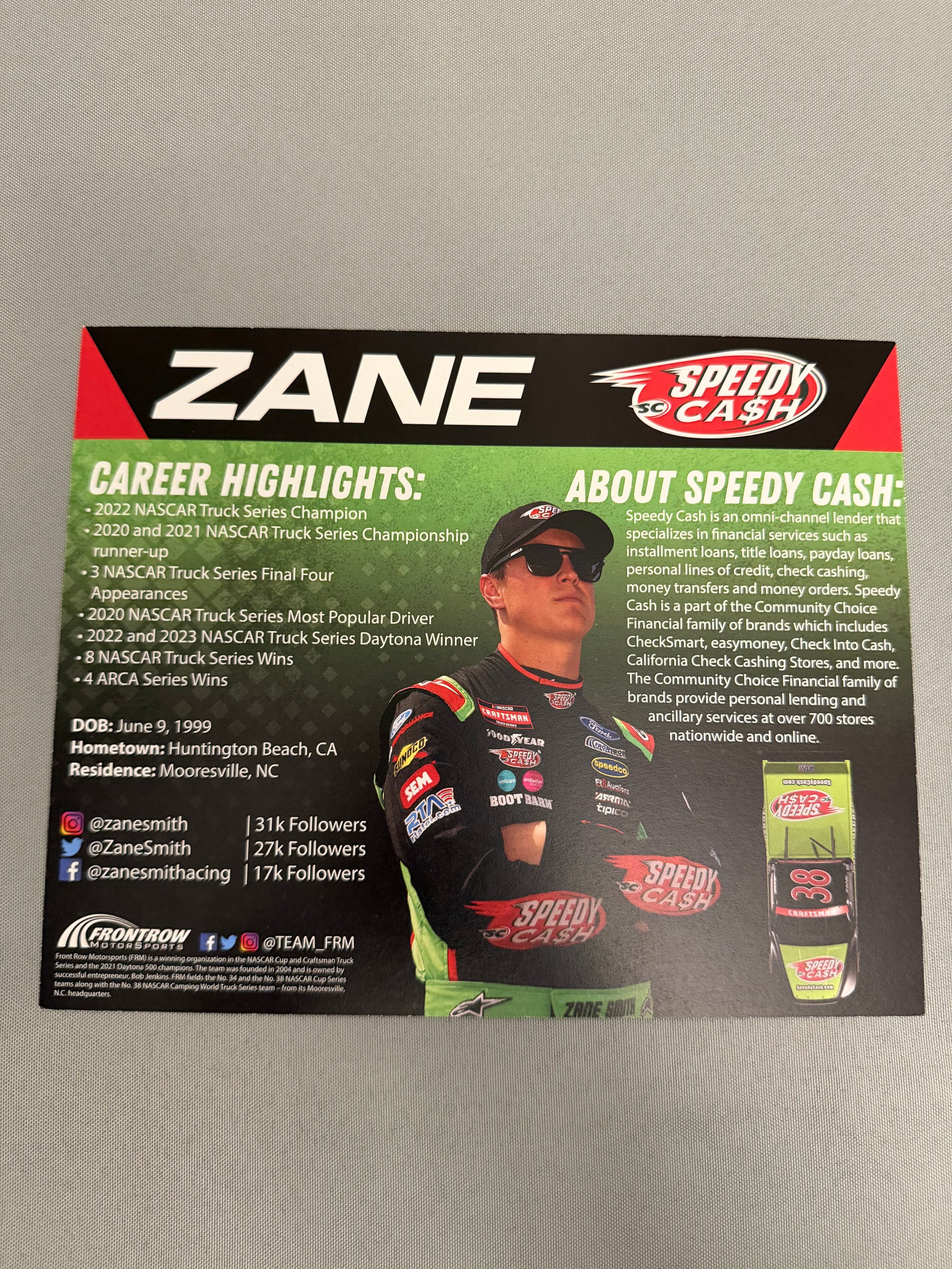 Zane Smith #38 2023 Speedy Cash Nascar Hero Card